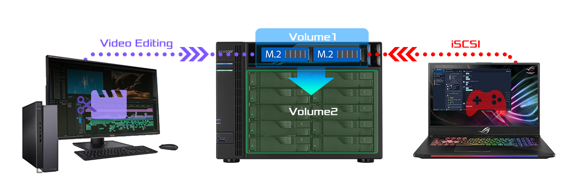 Creating an M.2 SSD volume brings even more functionality to an ASUSTOR NAS than ever before. Content creators will love the expanded speed when editing audio and video files on the M.2 SSD volumes while mobile gamers will find that creating an iSCSI volume in the M.2 SSDs enables the ability to install games directly to the iSCSI volume on a NAS and are playable directly from a gaming laptop. Since many games exceed 50-100 GB, this enables tens or hundreds of games to be installed without having to uninstall games to make way for new ones. With the addition of M.2 SSD storage, total storage of an ASUSTOR NAS has been increased although to maintain speed, hard drive bays and M.2 slots cannot be combined in a RAID array.